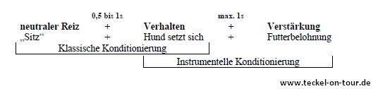 Es ist richtig, daß im Clickertraining sowohl klassische Konditionierung (ich sag nur "Pawlow und seine Hunde" ... na, klingelts?) wie auch instrumentelle Konditionierung (Mr. Skinner läßt grüßen), benutzt wird. Um genauer zu sein: Das Signal-Wort (z.B. "sitz") wird klassisch mit dem Verhalten "sitz" konditioniert, während die erfolgreich ausgeführte Übung instrumentell konditioniert (also z.B. mit einem Leckerchen belohnt) wird: