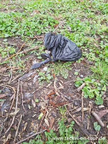 Ja, ich geb zu, manchmal machen wir unsere Geschäfte nicht so ganz in der Nähe von irgendwelchen Mülleimern. Ihr müsst die trotzdem aufsammeln. Ich verstehe ja, daß das doof für Euch ist. Trotzdem kann man diese Dinger dann nicht einfach in die Landschaft schmeißen. Die räumt ja niemand weg, wenn Ihr es schon nicht tut. Warum sollten andere Leute die Kotbeutel Eurer Hunde denn wegräumen müssen, wenn Ihr es schon nicht tut? Die müssen das nicht. Ihr aber schon, denn es ist die Hinterlassenschaft von Eurem Hund drin...