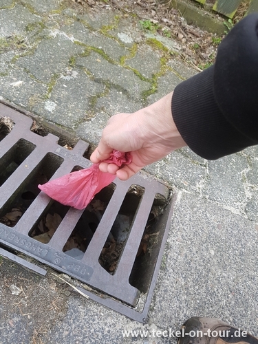 Und richtig! Bei dem etwas "versteckten" Gulli, bleibt der Typ stehen, geht in die Hocke und fummelt unten auf der Straße rum. Und damit hat er dann Antje so richtig auf den Plan gerufen! HA! Die hat den gleich mal gefaltet, und ihm verklickert, daß Plastik-Kotbeutel nicht in den Gulli gehören! Der Typ steht auf, den Kotbeutel noch in der Hand, hebt ihn hoch und stottert zurück "Ja ich weiß auch nicht..." und winkt mit dem Kotbeutel. Ja was weiß er nicht? Wo er den loswerden soll?! Pappnase! Im nächsten Mülleimer natürlich! Wo sonst?