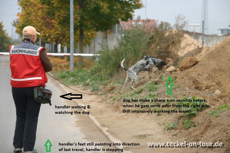Eigentlich (!!) hätte die Hundeführerin ihren Hund, der wie man sieht eindeutig den Trail arbeitet dort hin lassen müssen... Aber, wie wir alle wissen, ist dies bei "Hobbytrailern" so eine Sache, und gewissen Dinge die bei Einsatztrailern durchaus möglich sind, gehen bei uns absolut nicht! Und einen Trail rein zu Mäcces gehört ganz klar zu den "No-Go's!" in unserem Training! Das gibt nur Ärger, und deshalb hat die Hundeführerin ihren Mali hier leider auch - deutlich sichtbar (gespannte Leine, zurückgelehnter Oberkörper) - massiv bremsen müssen. Gleichzeitig zeigen ihre Fußspitzen bereits in die von ihr vermutete Richtung des Trailverlaufes, nämlich nach rechts. Dies sind körpersprachliche Signale, die der Hund durchaus mitbekommt, und ihn (sofern er nicht, wie hier, ohnehin den Trail super arbeitet) durchaus in die "richtige Richtung" drücken können!